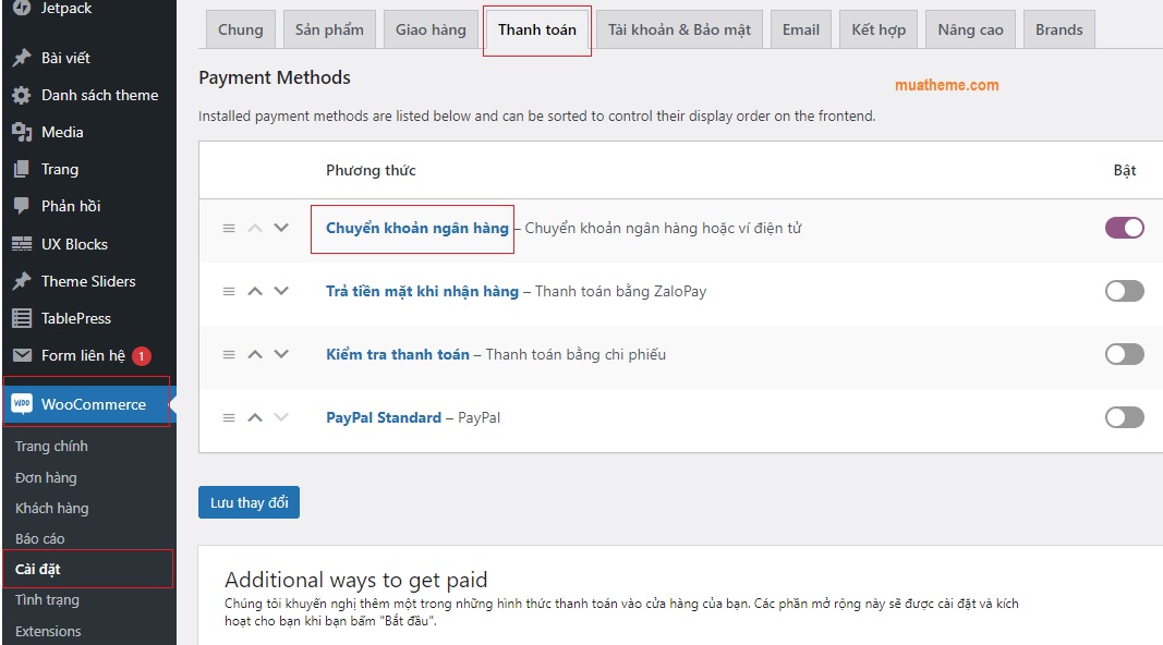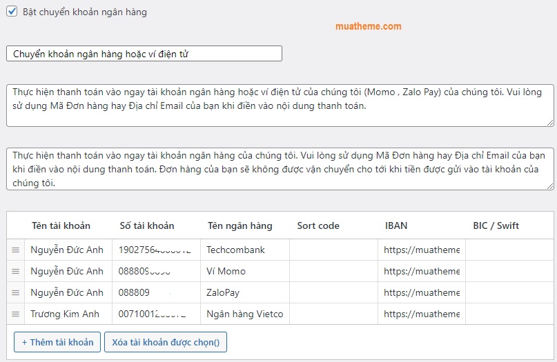 Bạn phải truy cập: Woocommerce -> Cài đặt -> Thanh toán để kích hoạt hình thức thanh toán là Chuyển khoản ngân hàng và nhập các thông tin ngân hàng của bạn tuần tự như hình nhé. Vì Việt Nam mình không dùng tới IBAN nên mình dùng trường đó để nhập link ảnh.