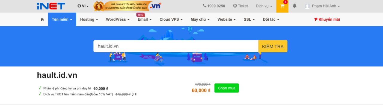 Là không gian tên miền mới, được cấp phát lần đầu tiên, còn rất nhiều tên miền đẹp đang tự do cùng với chính sách miễn phí 2 năm đầu tiên cho đối tượng từ 18 – 23 tuổi, tên miền .ID.VN chắc chắn là sự lựa chọn hấp dẫn mà nhiều người mong muốn sở hữu. Còn những ai không trong độ tuổi 18 – 23 tuổi thì cũng có thể đăng ký sử dụng với chi phí khá rẻ chỉ 60.000đ. Dưới đây iNET xin gửi tới Quý khách hướng dẫn chi tiết cách đăng ký tên miền .ID.VN tại iNET: