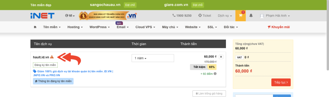 Bước 3: Nhập tên miền ID.VN cần đăng ký vào ô và bấm nút “KIỂM TRA”. và bấm tiếp tục đến giỏ hàng