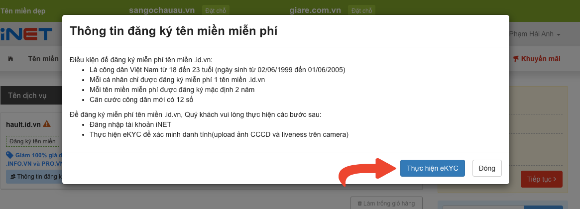 – Đối với khách hàng đủ điều kiện nhận tên miền .id.vn miễn phí => Quý khách hàng bấm vào mũi tên tam giác như hình dưới để tiến hành thực hiện eKYC