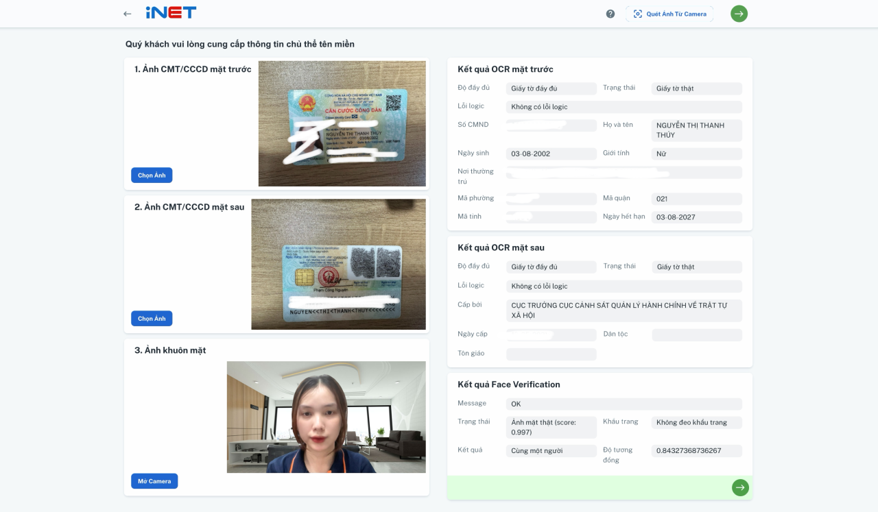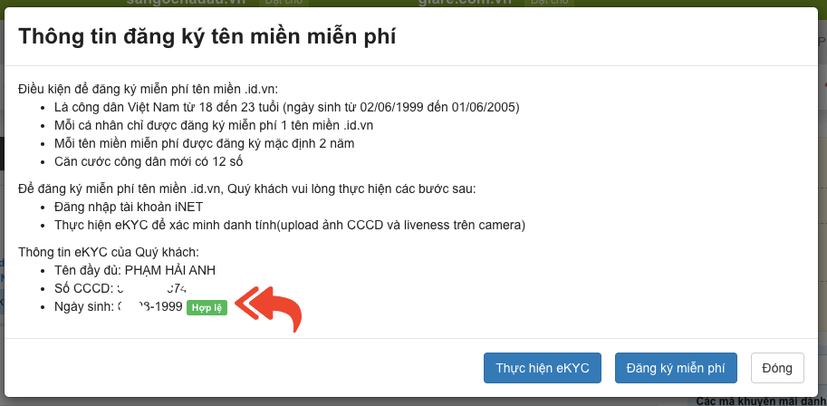 Tại hình tam giác đỏ Quý khách hàng bấm vào đó có thể kiểm tra được trạng thái eKYC của mình nếu báo xanh là tài khoản của Quý khách hàng hợp lệ có thể đăng ký 01 tên miền .id.vn miễn phí: