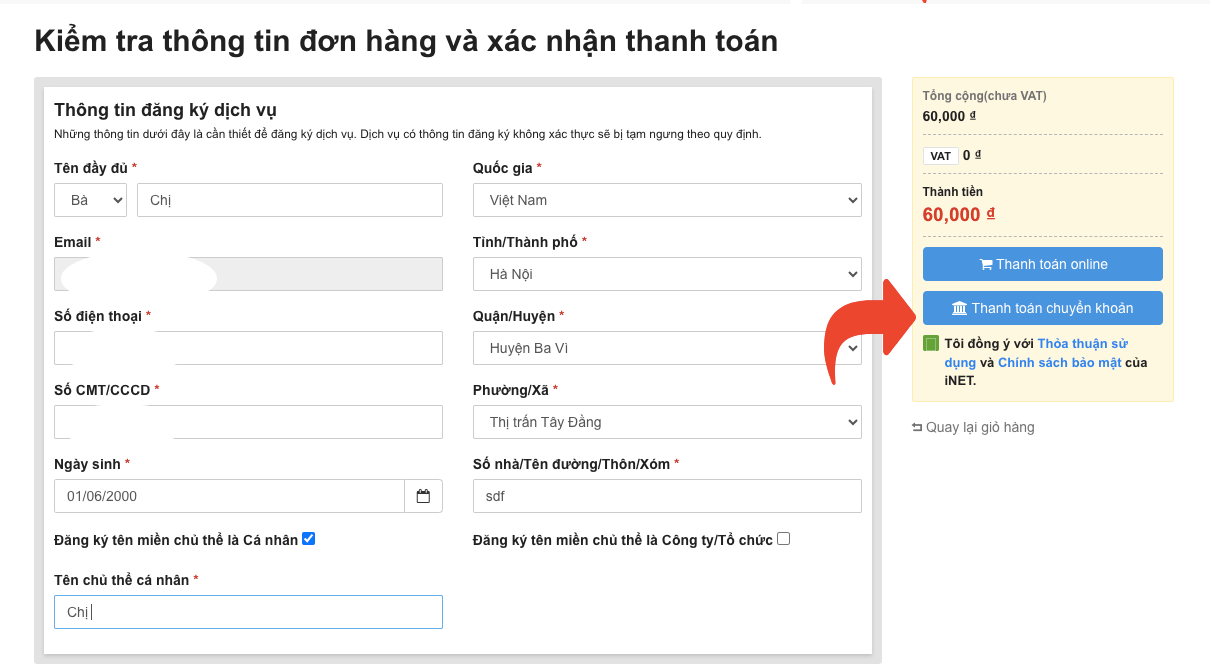 Nếu thông tin đã chuẩn xác, Quý khách bấm Thanh toán chuyển khoản. Sau đó đợi iNET liên hệ lại.