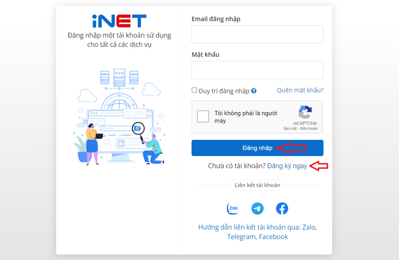 Bước 2: Đăng nhập vào tài khoản của Quý khách tại iNET (Nếu Quý khách chưa có tài khoản iNET, Quý khách bấm nút “Đăng ký ngay” như hình trên để đăng ký tài khoản trước => Sau khi đăng ký tài khoản iNET xong Quý khách truy cập lại vào link https://inet.vn để đăng ký tên miền)