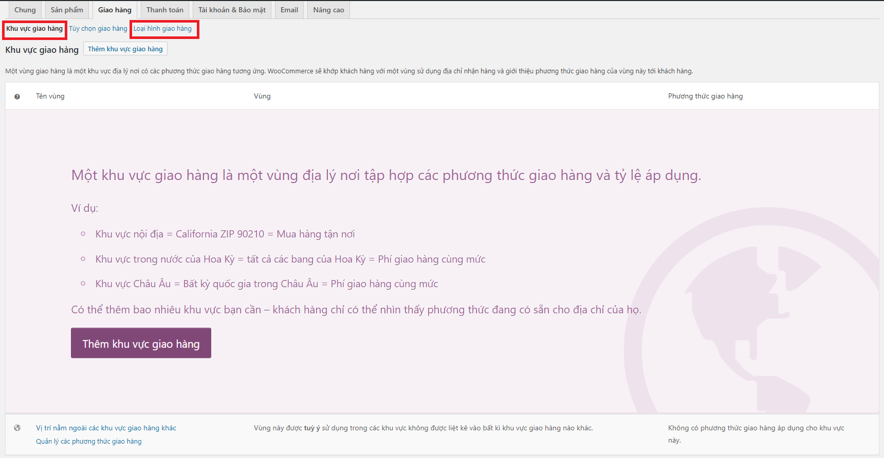 Bước 1: Truy cập WooCommerce -> Thiết lập -> tab Giao hàng