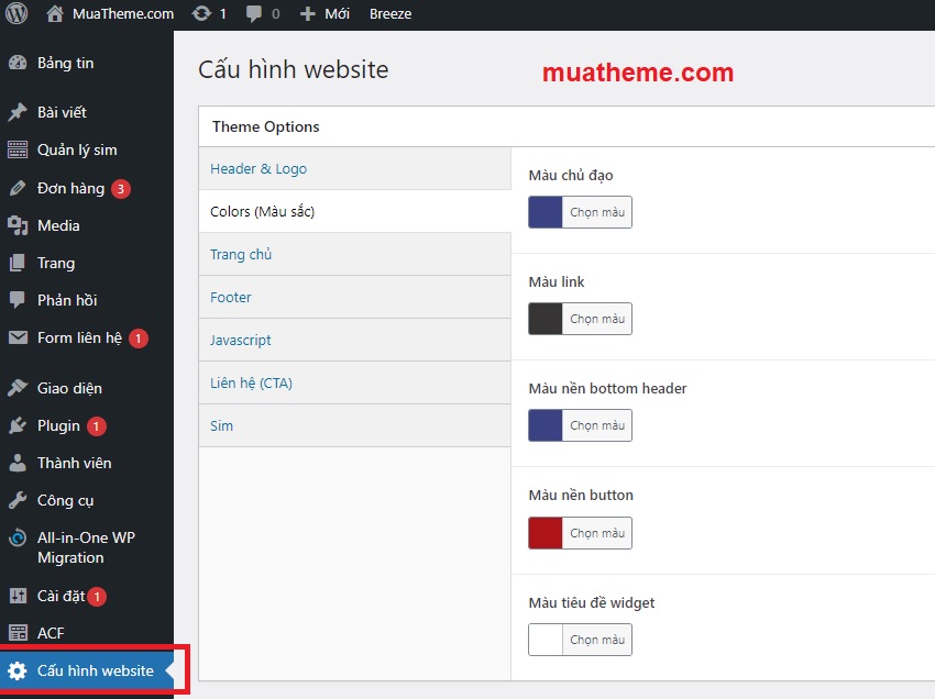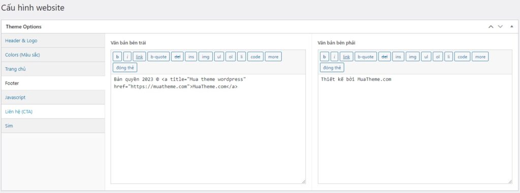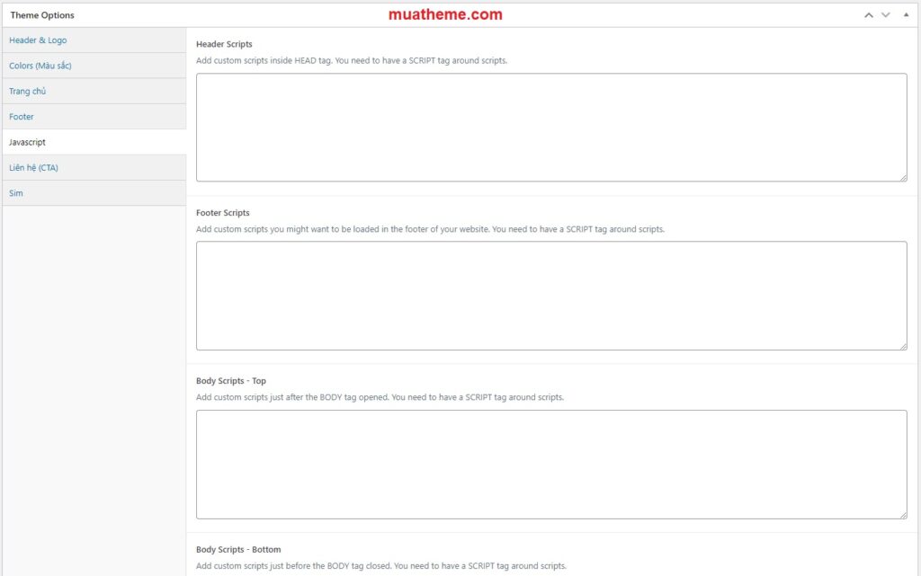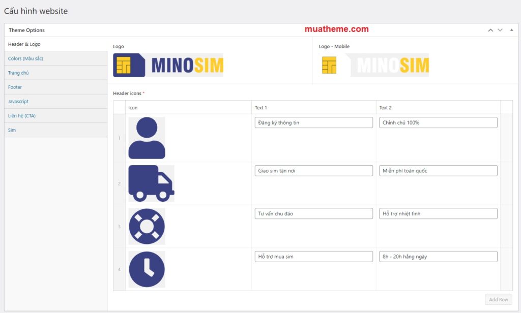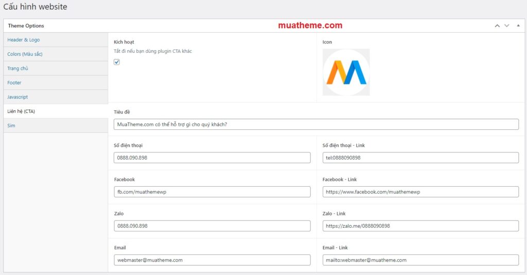 Tại đây bạn có thể thay đổi logo, các icon, thông tin liên hệ (email, số điện thoại…), màu sắc chủ đạo , thêm mã nhúng javascript (google analytics)…
