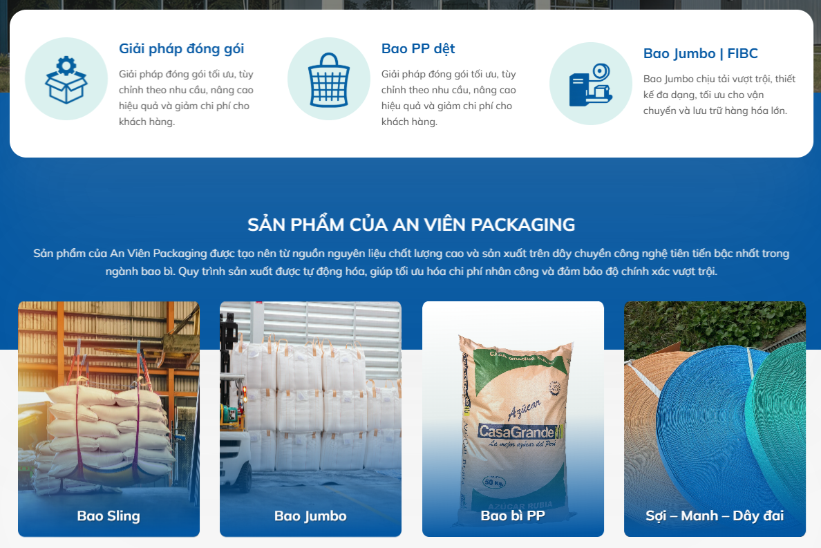 Trong ngành bao bì, thiết kế web không nên lấn át sản phẩm. Chúng tôi xử lý hình ảnh tối giản nhưng hiệu quả, sản phẩm được đặt trên nền trơn, ánh sáng mềm, phối cảnh thực tế, giúp khách hàng dễ dàng hình dung chất lượng và ứng dụng.