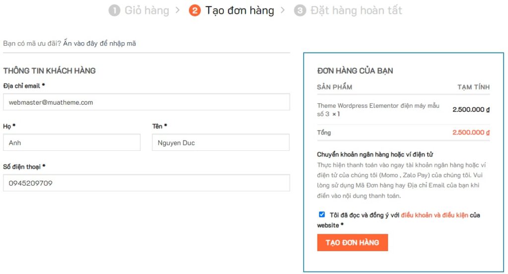 Sau khi bấm nút đặt mua, website của chúng tôi sẽ tự chuyển hướng đến trang Tạo đơn hàng. Hoặc bạn truy cập vào trang Tạo đơn hàng theo đường dẫn: https://muatheme.com/checkout/